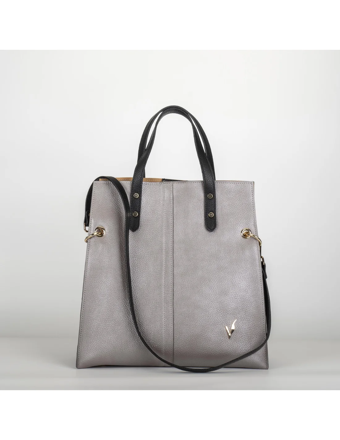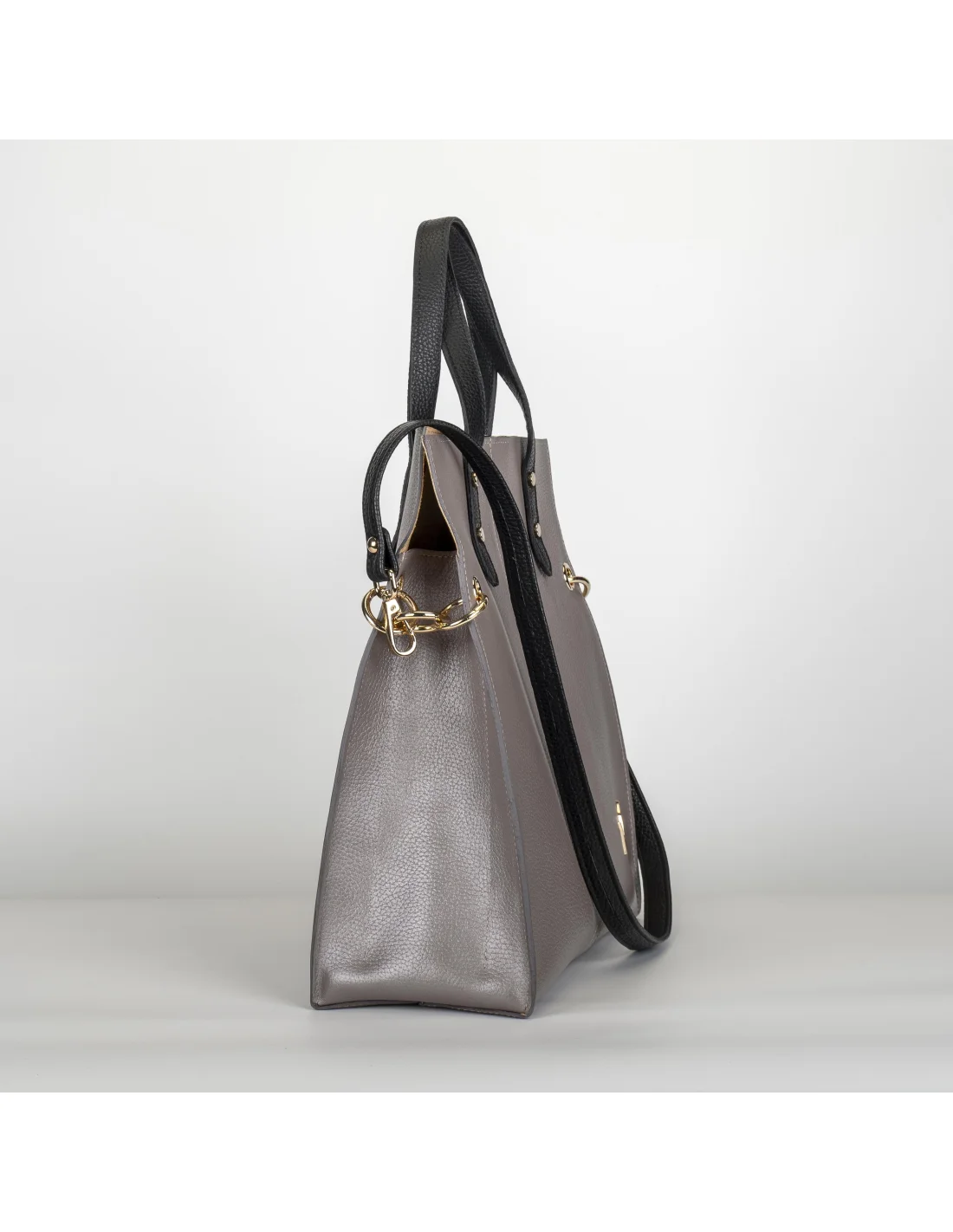 Cu o silueta structurata din piele bizonata, groasa, de bovina, se deschide prin magnet catre un interior spatios cu buzunare dedicate articolelor tale esentiale zilnice. Este o geanta captusita la interior, avand 3 compartimente generoase, cel din mijloc, mare cat toata geanta, este asigurat cu fermoar si are pe peretii interiori alte 3 buzunare, dintre care unul cu fermoar. Dispune atat de torti pentru a o purta elegant in mana cat si curea lunga pentru umar, reglabila prin catarama.